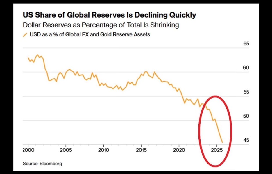 Global confidence in the US dollar is visibly waning. Its share of global foreign-exchange and gold reserve assets has dropped to around 45 percent, down from more than 60 percent at the start of the decade according to Bloomberg. Even excluding gold, the dollar accounts for roughly 57 percent of FX reserves, the lowest level since 1994, over three decades ago, per IMF figures. Central banks have aggressively diversified away from dollar assets, especially since the 2022 freezing of Russian reserves that highlighted the risks of fiat denominated assets held abroad. Global trade settled in dollars has also fallen to about 40 percent from 54 percent a few years ago, according to SWIFT data.