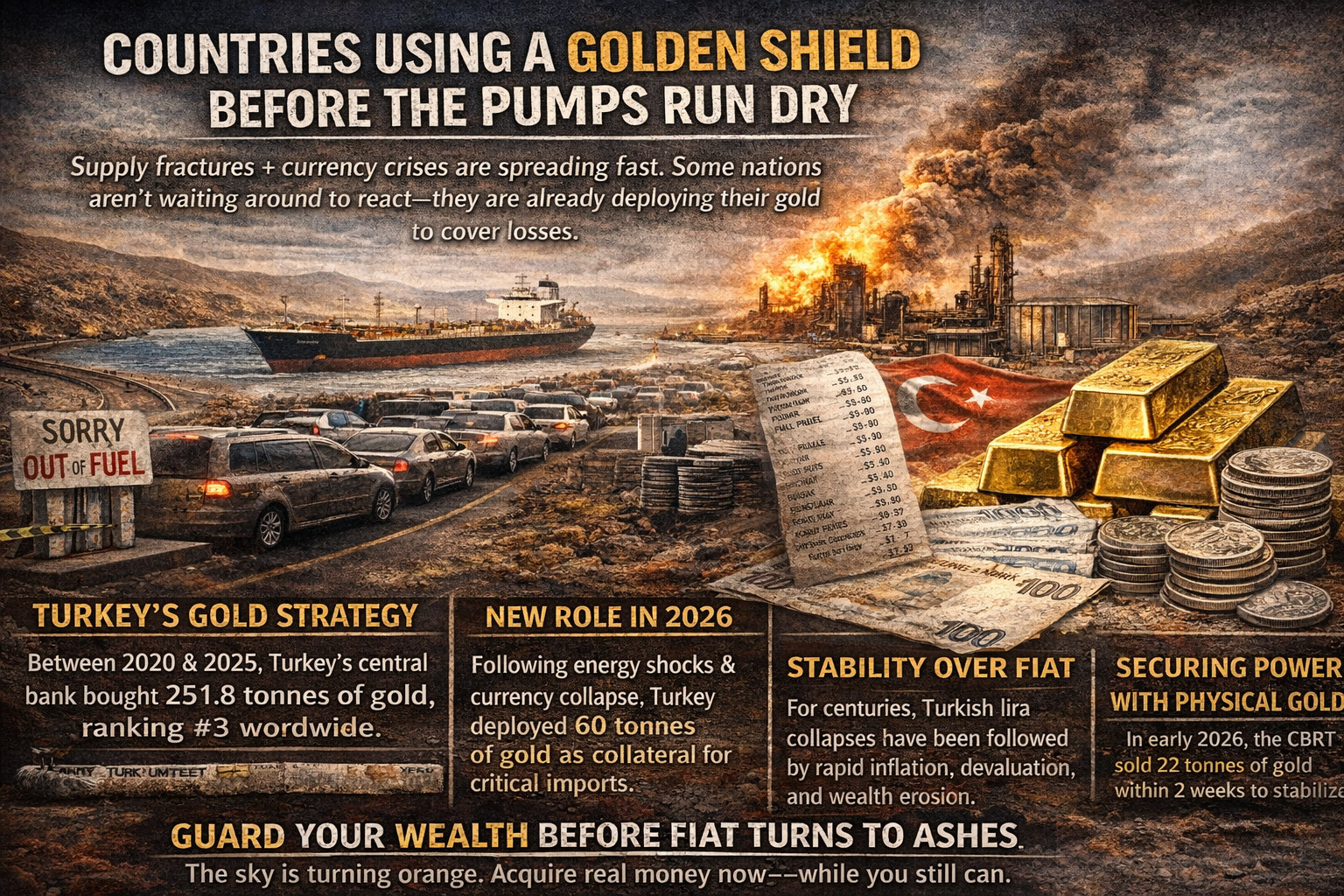 The era of inexpensive, abundant fuel and implicit faith in fiat systems is drawing to a close – amid fire, smoke, and ruptured supply chains. The Turkish lira’s collapse reveals the human and economic cost when currencies fail decisively. Turkey’s gold playbook reveals the rational countermeasure: build the position first, then use it without hesitation when necessity demands.