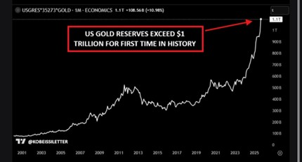 Across the Pacific, the U.S. Treasury’s gold reserves have quietly crested a psychological Rubicon: $1 trillion in market value, the first time ever. At 8,133 tonnes (unchanged since 1971 and also unaudited), the Fort Knox stash – booked at a quaint $42.22 USD per ounce or $11 billion – now commands this bounty thanks to spot gold’s 46% year-to-date rally to $3,857 USD per ounce.