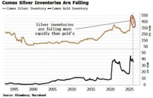 Exhibit A: COMEX silver inventories are plummeting, falling more rapidly than their gold supply in recent months. Look at the chart below – stockpiles have nosedived since 2020, accelerating into 2026, while gold, still falling, is holding a steadier outflow. This isn’t random; it’s a signal of real-world demand for physical silver outpacing manipulated paper prices that sell a single ounce hundreds of times over.