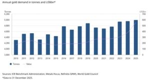 Zoom out, and the fundamentals scream “bullish” louder than ever. Total gold demand shattered records in 2025, surging past 5,000 tonnes for the first time in history. A staggering milestone driven by a relentless investment appetite for ETFs, bars, and coins alike from central banks, corporations, and retail buyers. The chart lays it bare: Demand lingered around 4,000-4,500 tonnes through the 2010s, then exploded higher, crossing the 5,000-tonne threshold posting an annual value of beyond $550 billion amid all-time high prices.