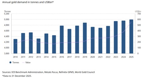 Zoom out, and the fundamentals scream “bullish” louder than ever. Total gold demand shattered records in 2025, surging past 5,000 tonnes for the first time in history. A staggering milestone driven by a relentless investment appetite for ETFs, bars, and coins alike from central banks, corporations, and retail buyers. The chart lays it bare: Demand lingered around 4,000-4,500 tonnes through the 2010s, then exploded higher, crossing the 5,000-tonne threshold posting an annual value of beyond $550 billion amid all-time high prices.