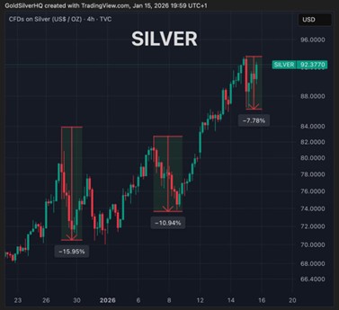 Correlate this with silver’s price action, as seen in the 4-hour CFD chart from TradingView. Just days ago, on January 15, 2026, silver experienced sharp pullbacks — drops of -15.95%, -10.94%, and -7.78% in quick succession — yet it’s rebounding with vigor, trading around $88 USD per ounce. These dips aren’t weaknesses; they’re launchpads. India, sensing the value, floods the physical market, buying up tons of the metal. This pattern repeats: a price surge, a brief retreat, and then new floors are established, providing foundational strength for the next upward leg.