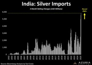 Silver’s price chart tells a story of resilience and opportunity that’s impossible to ignore. Every time the “paper” price—the futures market value—takes a dip, major players don’t hesitate; they pounce. Take India, the world’s largest silver importer, as a prime example. Recent data shows a staggering spike in imports, with the country’s 4-month rolling changes hitting record highs nearing $6 billion USD in value. As illustrated in the accompanying chart from Bloomberg, analyzed by Tavi Costa of Azuria Capital, India’s silver inflows have surged dramatically over the past two decades, with the latest peaks dwarfing historical norms.